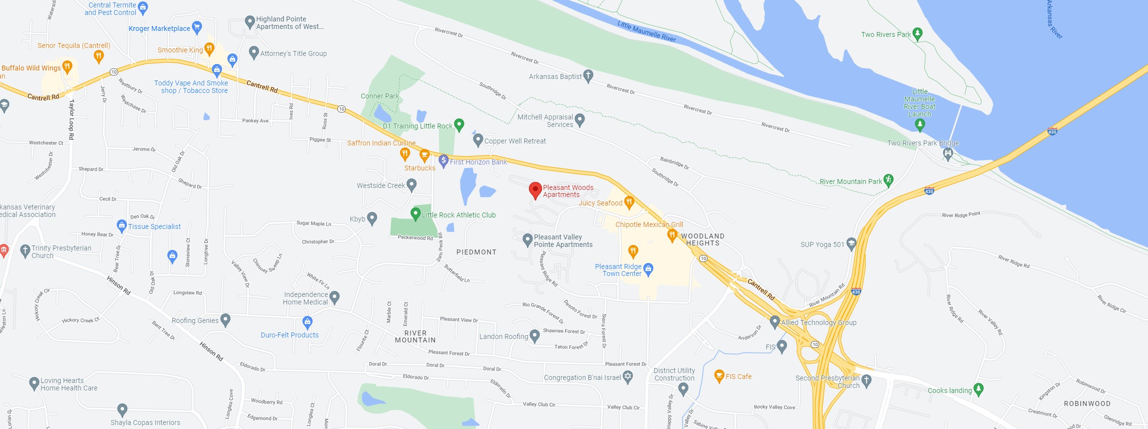 Pleasant Woods Apartments is located on 11800 Pleasant Ridge Rd in Little Rock, AR. We’re just around the corner from several grocery stores such as Kroger, The Fresh Market, and Walgreens. The beauty of Little Rock will not escape you as you venture out to nearby scenic destinations. Popular options include Two Rivers Park and River Mountain Park just minutes away! You’ll love our location as much as your new home.